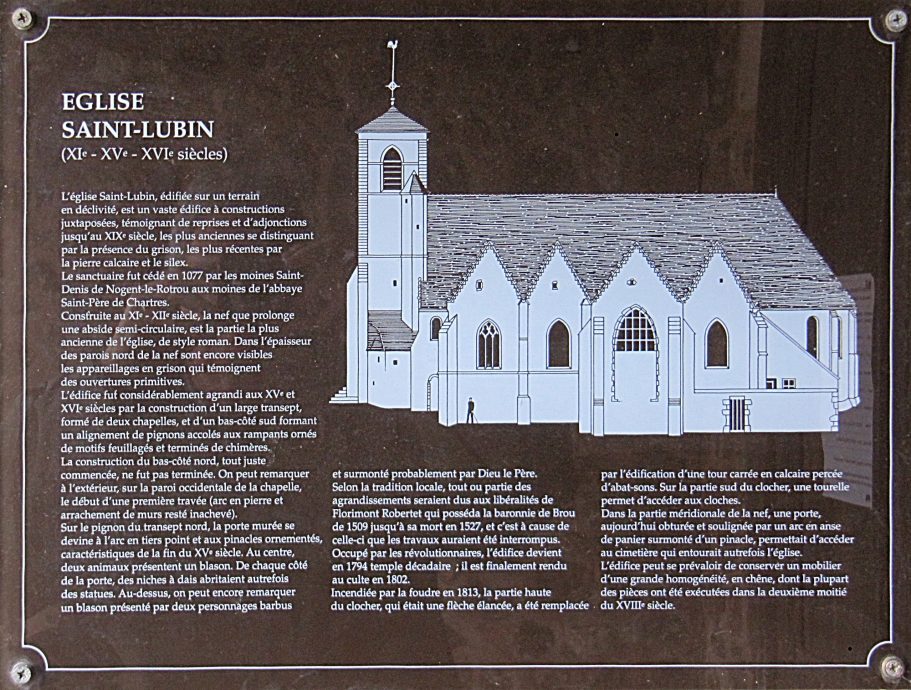 L'église Saint-Lubin, édifiée sur un terrain en déclivité, est un vaste édifice à construction juxtaposées, témoignant de reprises et d'adjonctions jusqu'au XIXe siècle, les plus anciennes se distinguant par la présence du grison, les plus récentes par la pierre calcaire et le silex.